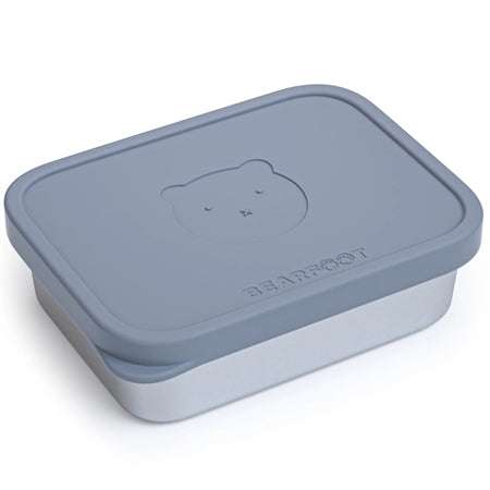 Madkasse til børn i rustfrit stål med blå silikonelåg og bamsetryk, lækagesikker og opvaskemaskinesikker.
