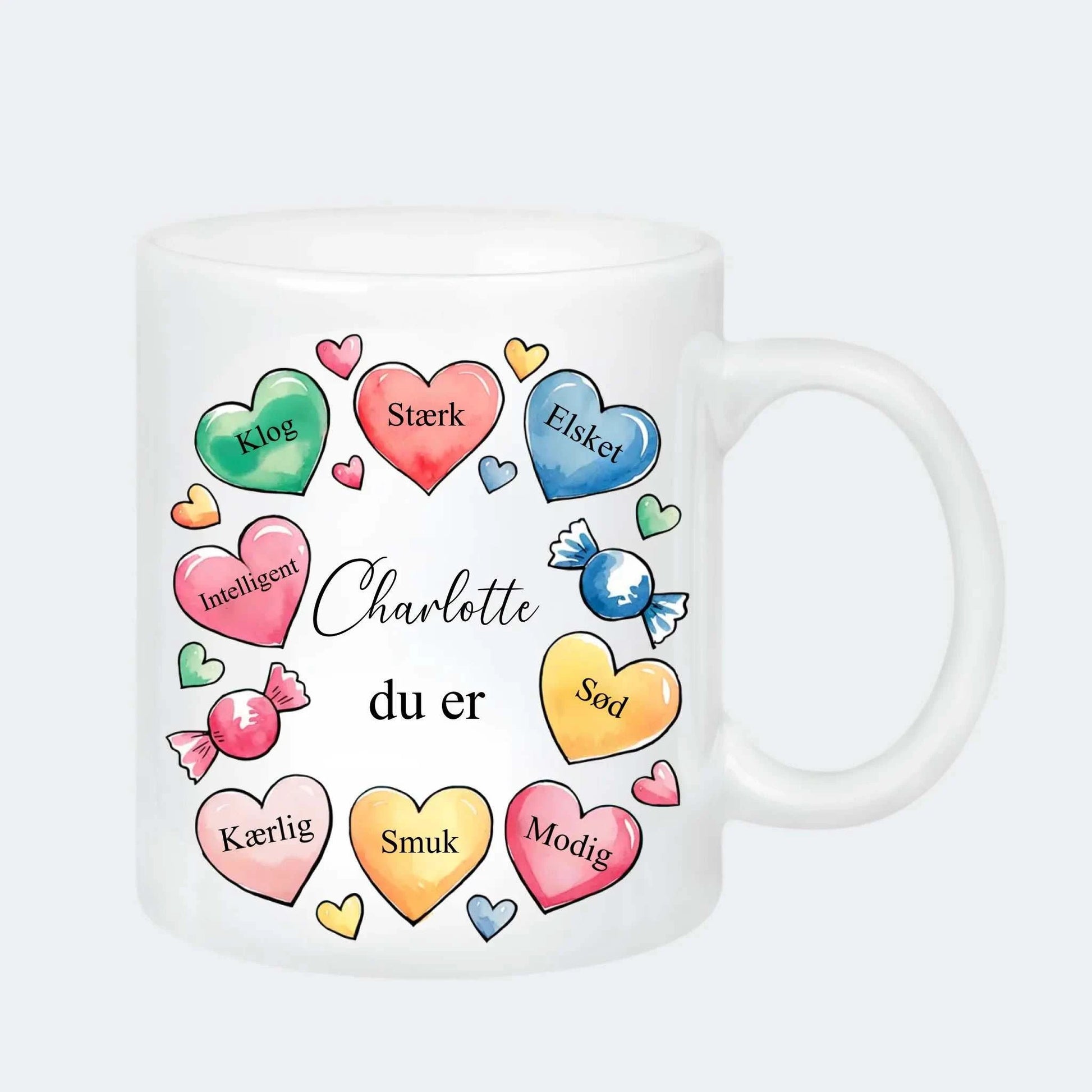 Gør hver kaffepause lidt mere kærlig med vores personlige keramik krus, der kombinerer søde ord, smukke hjerter og dit navn i centrum – bogstaveligt talt. Dette krus er ikke bare en praktisk hverdagsfavorit, men også en unik gaveidé, der varmer helt ind i sjælen.